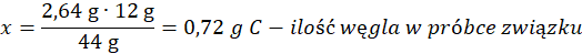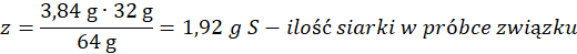 Cała siarka w SO2, cały węgiel w CO2 i cały wodór w otrzymanej wodzie pochodzą z użytego związku. Obliczamy ich ilości w otrzymanych produktach: