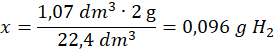 1 mol wodoru (2 g) w warunkach normalnych ma objętość 22,4 dm3. Masa wodoru wydzielonego w opisanej reakcji: