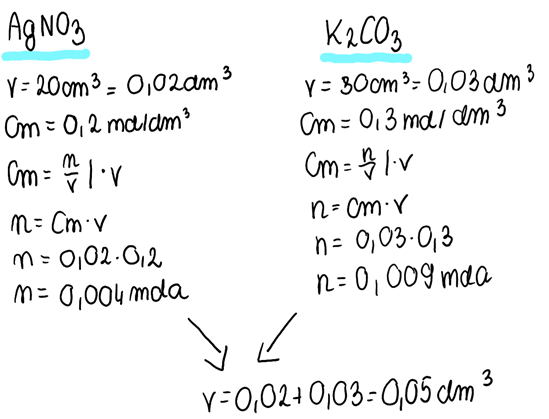 2. Mając informacje o substratach reakcji, z przekształconego wzoru na stężenie molowe obliczamy liczby moli substratów, a także sumaryczną objętość roztworu po zmieszaniu substratów: