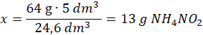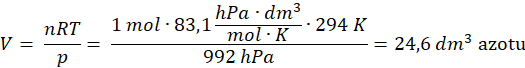 Z równania reakcji wynika, że z 1 mola soli powstaje 1 mol azotu – 24,6 dm3 w opisanych warunkach. Obliczamy ilość soli, z której powstanie 5 dm3: