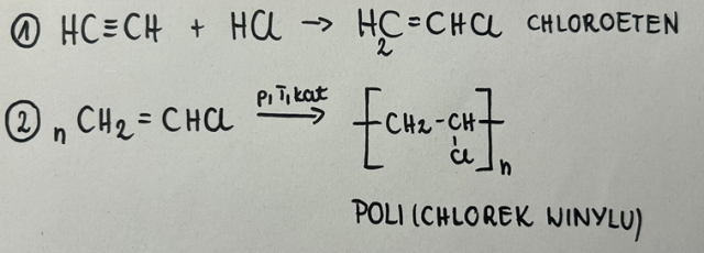 Dotyczy reakcji 2.: reakcja polimeryzacji polega na łączeniu się ze sobą wielu cząsteczek związku nienasyconego wskutek rozerwania wiązania typu p lub jednego z wiązań p w wiązaniu wielokrotnym. Produktem takiej reakcji jest wielkocząsteczkowy związek chemiczny.