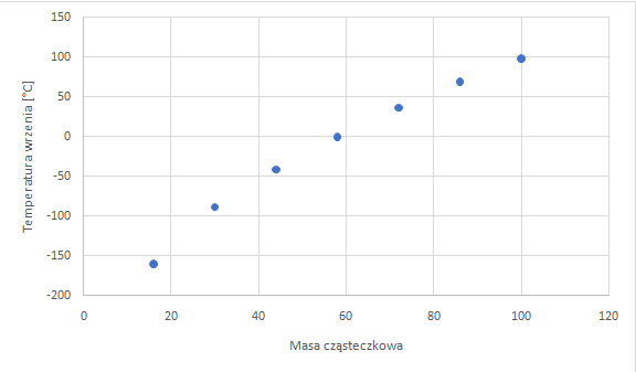 Na osi x umieść wartości mas cząsteczkowych, na osi y – wartości temperatur wrzenia.