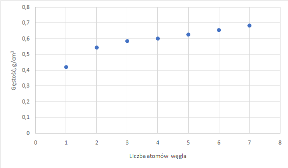 Wniosek: Gęstość alkanów zwiększa się wraz ze wzrastającą liczbą atomów węgla w cząsteczce alkanu.