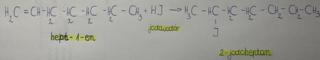 Zgodnie z regułą Markownikowa, w reakcji addycji cząsteczek niesymetrycznych (np. HCl, H2O), do niesymetrycznej cząsteczki alkenu atom wodoru przyłącza się do tego atomu węgla przy wiązaniu wielokrotnym, który jest połączony z większą liczbą atomów wodoru.