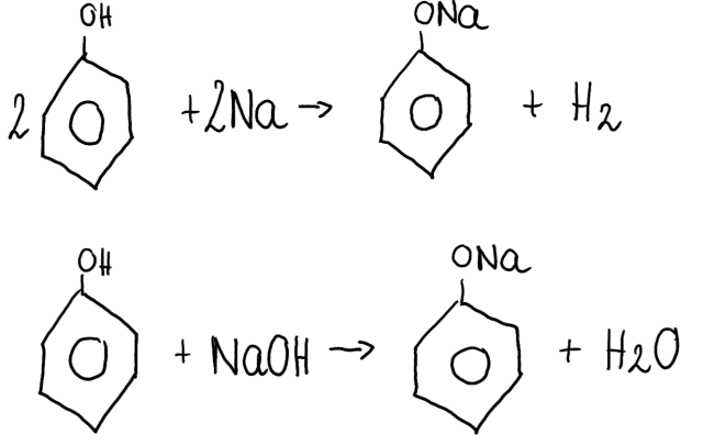 Fenole reagują z metalami aktywnymi I i II grupy układu okresowego oraz z zasadami, tworząc sole zwane fenolanami.