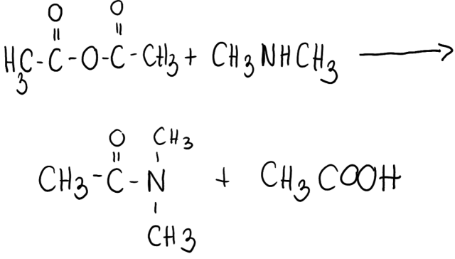 Używając wzorów półstrukturalnych, zapisz równanie reakcji bezwodnika octowego z dimetyloaminą.