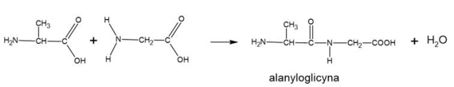 W tym zadaniu napisz równanie reakcji alaniny z glicyną i podaj nazwę produktu.