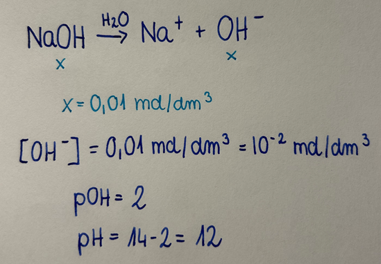 1. Zapisujemy równanie reakcji dysocjacji mocnej zasady, aby wiedzieć, jaki jest stosunek molowy całości zasady do anionów wodorotlenkowych- w przypadku elektrolitów mocnych należy przyjąć pewnego rodzaju przybliżenie- jeśli stosunek molowy zasady i anionów wodorotlenkowych jest jak 1:1 (w opisanym przypadku x:x), to ich stężenia są jednakowe.