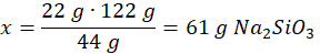 Z równania wiadomo, że na 1 mol krzemianu sodu – 122 g – powstaje 1 mol CO2 – 44 g. Ilość krzemianu jaka powstanie na 22 g CO2: