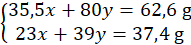 Przyjmij, że mamy próbkę 100 g mieszaniny, chlor i brom stanowią 62,6 g, a sód i potas – 37,4 g.