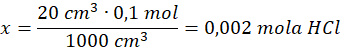 Ilość moli HCl w próbce 20 cm3 0,1-molowego kwasu: