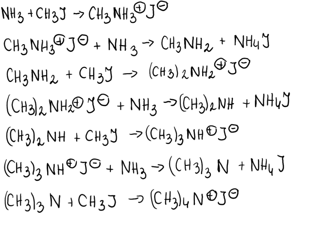 Alkilowanie amoniaku może prowadzić do powstania złożonej mieszaniny produktów, jakimi są aminy różnej rzędowości (I-, II- i III-rzędowe) oraz czwartorzędowa sól amoniowa.