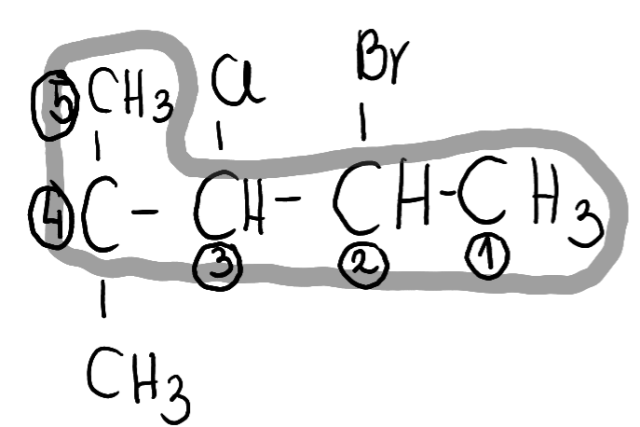 2. Ponumerować atomy węgla w łańcuchu głównym tak, aby lokanty wskazujące na położenie podstawników otrzymały możliwie najniższy numer.