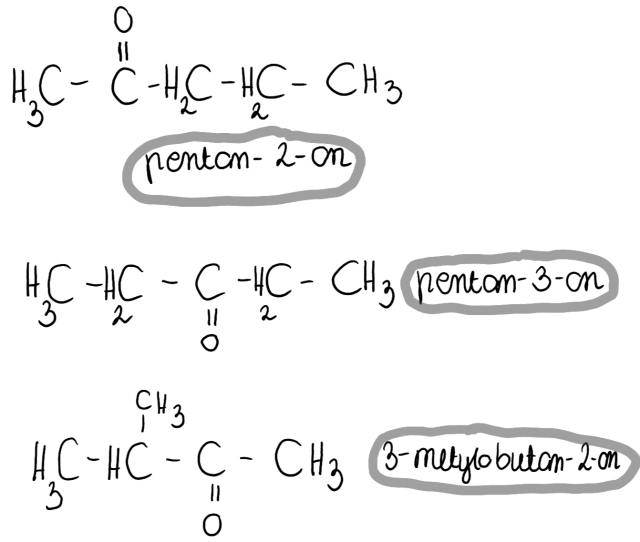 · Ketony, które w swojej strukturze mają co najmniej 5 atomów węgla, mogą różnić się położeniem grupy karbonylowej, dlatego w nazwach takich ketonów należy między rdzeniem nazwy a końcówką „-on” wpisać lokant atomu węgla w grupie karbonylowej.