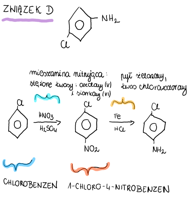 Przedstaw wzór półstrukturalny związku D ( 4-chlorofenyloaminy), a następnie uzupełnij schemat reakcji otrzymywania tej aminy. Nazwij związek B oraz wyjściowy substrat. Wymień odczynniki A i C zastosowane w tych reakcjach.