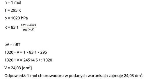 Jaka jest objętość 1 mola chlorowodoru w temperaturze 295 K oraz pod ciśnieniem 1020 hPa?