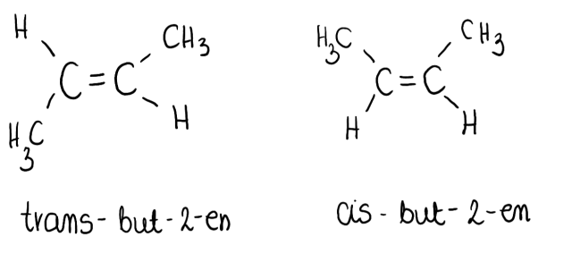 Gdy cięższe podstawniki połączone z atomami węgla tworzącymi wiązanie podwójne znajdują się po tej samej jego stronie, mamy do czynienia z izomerami typu cis. Jeśli podstawniki te zlokalizowane są po przeciwnych stronach wiązania podwójnego- są to izomery trans.