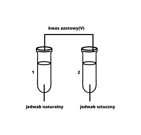 Do pierwszej probówki wrzucamy kawałek jedwabiu naturalnego, a do drugiej kawałek jedwabiu sztucznego. Następnie do obu probówek dodajemy stężony kwas azotowy(V).