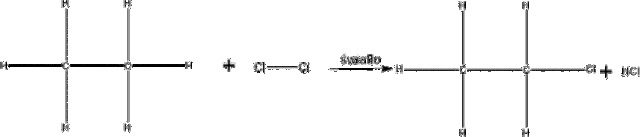Zachodzi podstawienie atomu wodoru przez atom chloru pod wpływem światła. Produktem jest chloroetan, a produktem ubocznych chlorowodór.