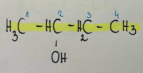 1. Wyodrębniamy najdłuższy możliwy węglowy łańcuch główny, zawierający w strukturze atom węgla połączony bezpośrednio z grupą funkcyjną -OH.
