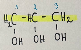 1. Wyodrębniamy najdłuższy możliwy węglowy łańcuch główny, zawierający w strukturze atom węgla połączony bezpośrednio z grupą funkcyjną -OH.