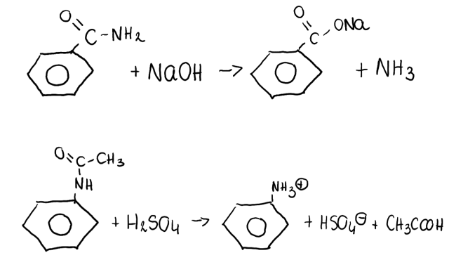 Ustal, czy mając do dyspozycji roztwory wodne H2SO4 i NaOH, można rozróżnić oba przedstawione amidy. Zapisz równania zachodzących reakcji chemicznych.