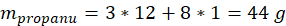 1. Wykorzystując masy pierwiastków zaczerpnięte z układu okresowego, obliczamy masę 1 mola propanu: