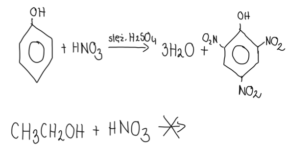 3. Reakcja z HNO3- w probówce z etanolem brak widocznych zmian, w probówce z fenolem pojawia się żółty osad.