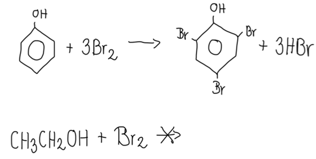 1. Reakcja z wodą bromową- fenol odbarwia brunatną wodę bromową, a etanol z nią nie reaguje.
