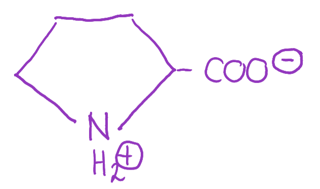 Narysuj wzór półstrukturalny jonu obojnaczego tworzonego przez prolinę.
