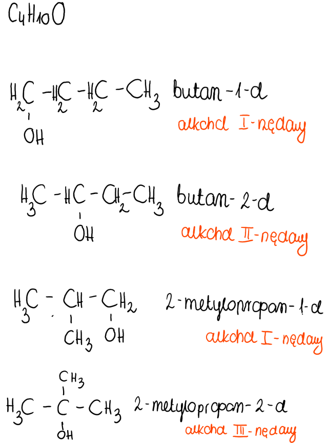 Zapisz wzory i nazwy wszystkich alkoholi, które mają wzór sumaryczny C4H10O. Ustal ich rzędowość.