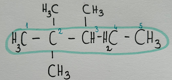 Aby prawidłowo nazwać rozbudowany węglowodór, należy wyodrębnić w nim najdłuższy możliwy łańcuch główny. W przypadku powyższych węglowodorów został on wyraźnie zaznaczony, a atomy węgla ponumerowane w taki sposób, aby najniższe numery (lokanty) otrzymały atomy węgla, które łączą się z podstawnikami (fragmentami zlokalizowanym poza łańcuchem głównym) „najszybciej”, tj. zaczynamy od atomu węgla, który znajduje się bliżej jak największej ilości podstawników.