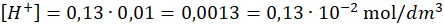 Ponieważ kwas jest jednohydronowy to ilość zdysocjowanych cząsteczek odpowiada ilości powstałych H+, a ponieważ mamy 1 dm3 roztworu to jest to też stężenie.