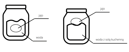 Obserwacje: Po włożeniu jaja do czystej wody jajo opada na dno słoika. Po włożeniu jaja do wody z solą kuchenną jajo unosi się na wodzie.