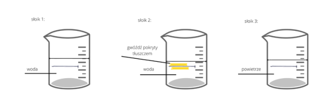 Słoik 1: gwóźdź pokrył się brunatnoczerwonym nalotem – korozja,