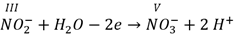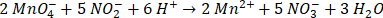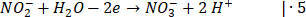 W procesie utleniania jony NO2- zmieniają się w jony NO3-‑ więc trzeba im „dostarczyć tlenu” i w środowisku kwasowym służy do tego woda. Równanie redukcji można zapisać następująco: