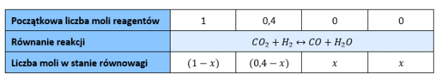 Ponieważ objętość reaktora wynosi 1 dm3, stężenia reagentów możemy zastąpić liczbami ich moli. Oznaczamy symbolem