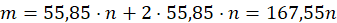 Liczby moli tlenków żelaza są sobie równe, a masa żelaza w mieszaninie odpowiada kolejno n oraz 2n, ponieważ jeden z tlenków zawiera dwa razy więcej atomów żelaza niż drugi.