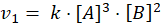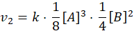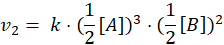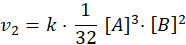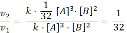 Szybkość reakcji zmniejszy się 32 razy, ponieważ w równaniu występują wykładniki potęg o wartości odpowiednio 2 i 3. Szybkość reakcji zmniejsza się zatem 22× 23 razy.
