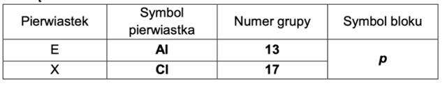 Uzupełnij tabelę, wpisując symbole chemiczne pierwiastków E i X, numer grupy w układzie okresowym oraz symbol bloku konfiguracyjnego, do których należą.
