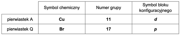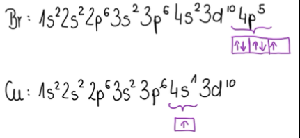 Konfiguracje miedzi i bromu wskazujące, że posiadają one jeden niesparowany elektron: