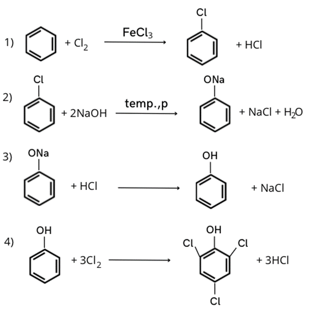 Czwarta reakcja to również reakcja substytucji elektrofilowej. Jest to chlorowanie fenolu. Grupa -OH w fenolu jest podstawnikiem pierwszego rodzaju, co powoduje, że atomy chloru kierują się w pozycję orto- i para- (2 i 6). Fenol jest związkiem bardzo reaktywnym i produktem chlorowania fenolu jest 2,4,6-trichlorofenol.