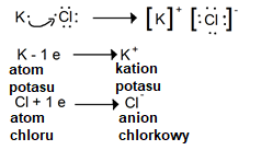 Wiązanie jonowe polega na całkowitym przeniesieniu jednego lub więcej elektronów z jednego atomu (mniej elektroujemnego) do drugiego atomu (bardziej elektroujemnego), w wyniku czego z atomów, które utraciły elektrony, tworzą się jony dodatnie (kationy), a z atomów, które zyskały elektrony, tworzą się jony ujemne (aniony).