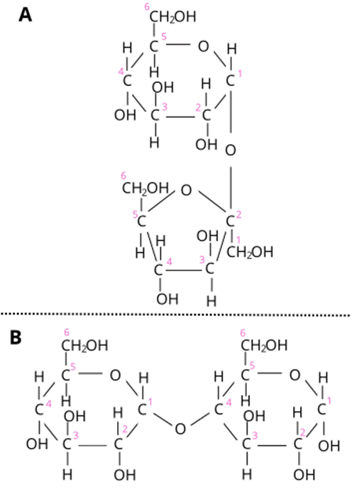 2. Fragmenty monosacharydów w disacharydzie A są połączone wiązaniem α,β-1,2-O-glikozydowym, a disacharydzie B α,β-1,4-O-glikozydowym. → prawda (P)