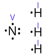 Wzory elektronowe Lewisa to takie wzory, które przedstawiają schematycznie rozmieszczenie elektronów walencyjnych jako kropki. Liczba elektronów walencyjnych różni się dla każdego z atomów, ale często odpowiada ona numerowi grupy lub w przypadku pierwiastków w grupach 11-18 – cyfrze jedności. Azot leży w grupie piętnastej i ma pięć elektronów walencyjnych. Atomy wodoru leżą natomiast w grupie pierwszej i każdy z nich ma jeden elektron walencyjny. Fioletowe oznaczenia cyfr rzymskich nie są wymagane - jest to jedynie pomoc dla Ciebie.