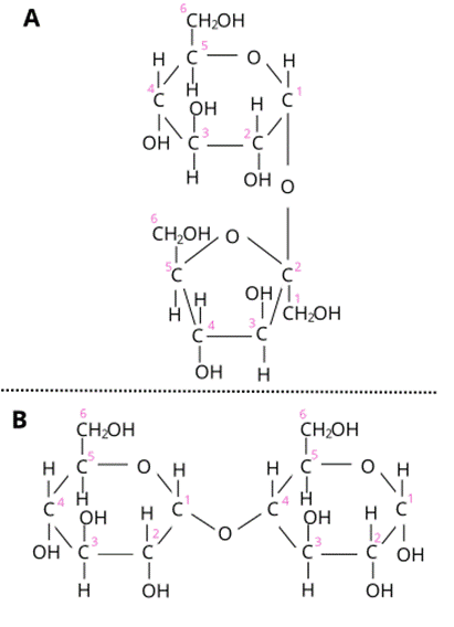 2. Fragmenty monosacharydów w disacharydzie A są połączone wiązaniem α,β-1,2-O-glikozydowym, a disacharydzie B α,β-1,4-O-glikozydowym. → prawda (P)