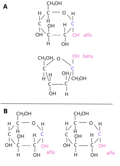 Zwróć uwagę, że cukier A to sacharoza, a cukier B to maltoza. Sacharoza zbudowana jest z α-glukozy i β-fruktozy. Natomiast maltozę buduję dwie cząsteczki α-glukozy. Jest to wiedza teoretyczna. Jeśli nie pamiętasz, co buduje dwucukry - można sprawdzić konfigurację cukrów prostych. W cukrach α grupa -OH przy anomerycznym atomie węgla jest pod pierścieniem, a w cukrach β - nad. Grupa hydroksylowa była miejscu, gdzie teraz jest wiązanie O-glikozydowe. Na fioletowo zaznaczono anomeryczne atomy węgla. Na różowo grupy -OH, które pozwolą wskazać konfigurację. Rysunek przedstawia monocukry, z których powstały dwucukry A i B.