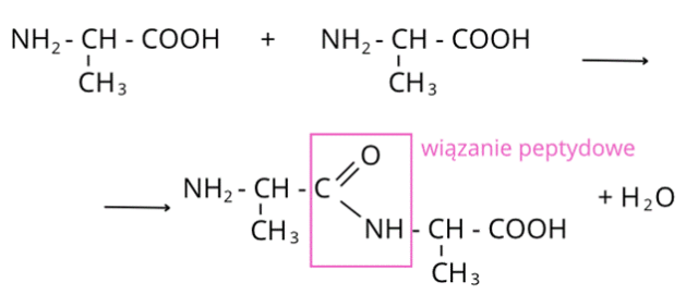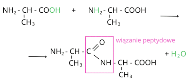 Wzoryposzczególnychaminokwasówznajdziesz w tabeliaminokwasów. Dipeptydypowstają w wynikureakcjidwóchaminokwasów. Resztyaminokwasowepołączonesąwiązaniem —CO—NH—. W tworzeniuwiązaniabierzeudział grupakarboksylowaiaminowa. Ulegają one połączeniu. Grupa karboksylowa „pozbywasię” cząstki -OH, a grupaaminowajednegoatomuwodoru. Stądproduktemubocznym jest woda. Zaznaczono to nazielono.