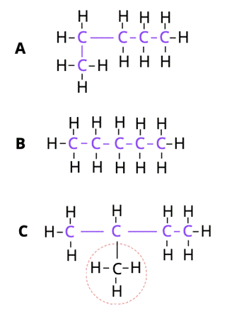 W pierwszej kolejności policz liczbę atomów w każdym ze związków – każdy z nich ma pięć atomów węgla i dwanaście atomów wodoru. Zaznacz łańcuchy główne. Oznaczono je kolorem fioletowym. Łańcuch główny to taki, który jest najdłuższy. Na ich podstawie zwróć uwagę, że związki A i B to te same substancje – zostały jedynie narysowane inaczej. Związki A i B to pentan. Natomiast związek C ma czterowęglowy łańcuch główny, a przy drugim atomie węgla jest podstawnik metylowy. Związek C to 2-metylobutan. Izomery konstytucyjne (czyli strukturalne) różnią się połączeniem atomów węgla w cząsteczce. Stąd takimi izomerami są związki A i C oraz B i C.