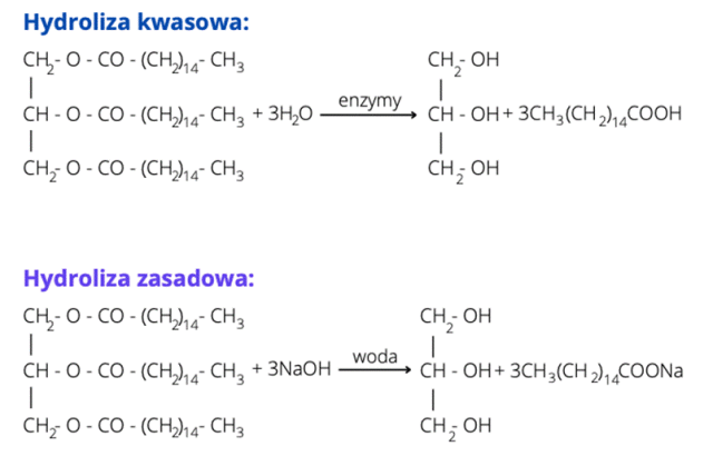 W pierwszym kroku zapisz wzór tripalmitynianu glicerolu. Jest to tłuszcz zbudowany z glicerolu i kwasu palmitynowego. Hydroliza kwasowa powoduje powstanie tych samych produktów, z których powstaje tłuszcz. Hydroliza w środowisku zasadowym (zmydlanie) pozwala na uzyskanie glicerolu i mydła, czyli soli kwasu tłuszczowego.